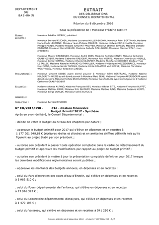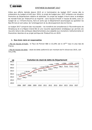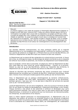 Le présent rapport a pour objet de proposer à l’Assemblée départementale d’adopter le budget primitif (BP) pour l’exercice 2017. Grâce aux efforts réalisés depuis 2015 et à l'anticipation du budget 2017 voulue dès la préparation du budget primitif pour 2016, le projet de budget pour 2017 présente une situation financière du Département saine, rétablie et stabilisée. Ce projet de budget s'inscrit dans la stratégie de mandat fixée par l'Exécutif et sa majorité : sans hausse d'impôt ni hausse de dette, avec un budget opérationnel d'un milliard d'euros, faire en sorte que le Département accompagne au quotidien les Bas-Rhinois et soit acteur de l'aménagement et du développement des territoires.