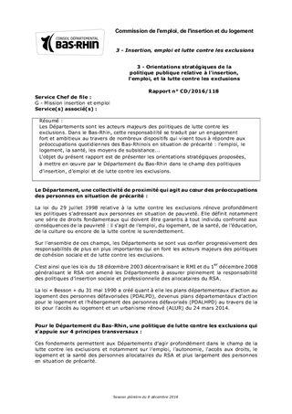 Les Départements sont les acteurs majeurs des politiques de lutte contre les exclusions. Dans le Bas-Rhin, cette responsabilité se traduit par un engagement fort et ambitieux au travers de nombreux dispositifs qui visent tous à répondre aux préoccupations quotidiennes des Bas-Rhinois en situation de précarité : l’emploi, le logement, la santé, les moyens de subsistance... L’objet du présent rapport est de présenter les orientations stratégiques proposées, à mettre en œuvre par le Département du Bas-Rhin dans le champ des politiques d’insertion, d’emploi et de lutte contre les exclusions.