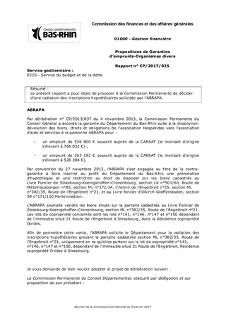 Le présent rapport a pour objet de proposer à la Commission Permanente de décider d’une radiation des inscriptions hypothécaires sollicitée par l’ABRAPA.
