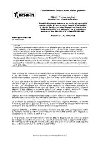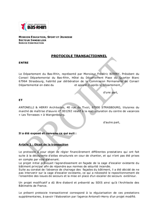 Au cours du chantier de restructuration du bâtiment principal de la maison de vacances "Les TERRASSES" à WANGENBOURG (début 2014), le bureau de contrôle chargé du suivi des travaux s'est aperçu d'un problème technique nécessitant des travaux supplémentaires et représentant un important surcoût. Le maître d'œuvre a élaboré une solution alternative permettant d'éviter ce surcoût. Il est proposé à Commission Permanente de décider d'approuver les termes d'un projet de protocole transactionnel à conclure avec l'agence ANTONELLI & HERRY Architectes, prévoyant le versement à cette agence d'une indemnité transactionnelle d'un montant de 3 600 € TTC.