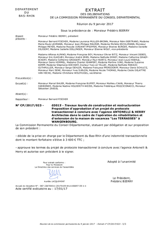 Proposition d'approbation d'un projet de protocole transactionnel à conclure avec l'agence ANTONELLI & HERRY Architectes dans le cadre de l'opération de réhabilitation et d'extension de la maison de vacances "Les TERRASSES" à WANGENBOURG.