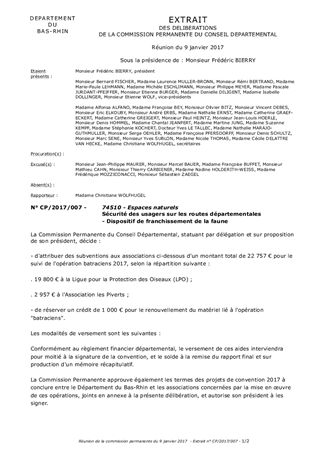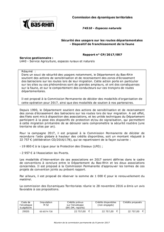 Dans un souci de sécurité des usagers notamment, le Département du Bas-Rhin soutient des actions de sensibilisation et de recensement des zones d’écrasement des batraciens sur les routes lors de leur migration. Cette action porte en particulier sur les sites ou ces phénomènes sont de grandes ampleurs, et ont des conséquences sur la faune, et sur le comportement des conducteurs sur ces tronçons de routes départementales. Il est proposé à la Commission Permanente de décider des modalités d'organisation de cette opération pour 2017, ainsi que des modalités de soutien à nos partenaires.