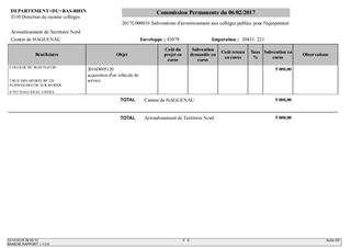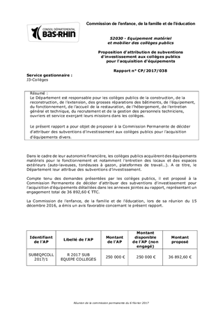 Le Département est responsable pour les collèges publics de la construction, de la reconstruction, de l’extension, des grosses réparations des bâtiments, de l’équipement, du fonctionnement, de l’accueil de la restauration, de l’hébergement, de l’entretien général et technique, du recrutement et de la gestion des personnels techniciens, ouvriers et service exerçant leurs missions dans les collèges. Le présent rapport a pour objet de proposer à la Commission Permanente de décider d'attribuer des subventions d'investissement aux collèges publics pour l'acquisition d'équipements divers.