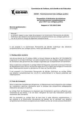 Le présent rapport a pour objet de proposer à la Commission Permanente de décider d'attribuer des dotations de fonctionnement complémentaires aux collèges publics en vue de la prise en charge de dépenses exceptionnelles.