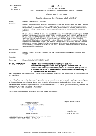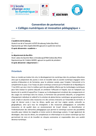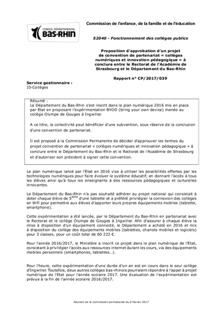 Le Département du Bas-Rhin s'est inscrit dans le plan numérique 2016 mis en place par Etat en proposant l’expérimentation BYOD (bring your own device) menée au collège Olympe de Gouges à Ingwiller. A ce titre, la collectivité peut bénéficier d'une subvention, sous réserve de la conclusion d'une convention de partenariat. Il est proposé à la Commission Permanente de décider d’approuver les termes du projet convention de partenariat « collèges numériques et innovation pédagogique » à conclure entre le Département du Bas-Rhin et le Rectorat de l’Académie de Strasbourg et d’autoriser son président à signer cette convention.
