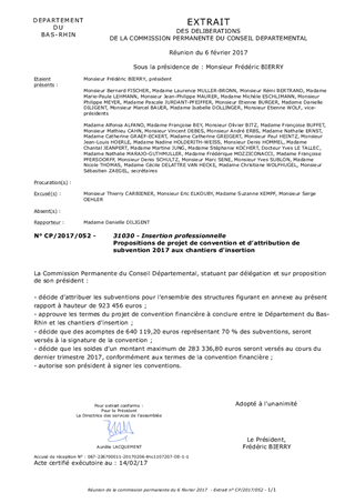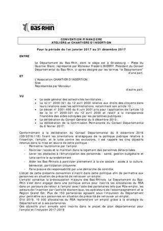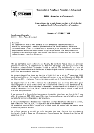 Le Département du Bas-Rhin attribue chaque année des aides financières aux structures en charge de l’insertion professionnelle des bénéficiaires du Revenu de Solidarité Active (RSA). Le présent rapport a pour objet de proposer à la Commission Permanente d'approuver les termes du projet de convention type à conclure entre le Département et chacune des structures d'insertion concernées, et d’attribuer des subventions aux chantiers d’insertion.