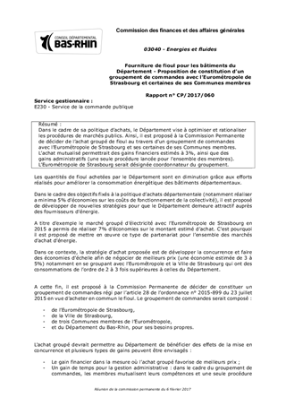 Dans le cadre de sa politique d’achats, le Département vise à optimiser et rationaliser les procédures de marchés publics. Ainsi, il est proposé à la Commission Permanente de décider de l’achat groupé de fioul au travers d'un groupement de commandes avec l’Eurométropole de Strasbourg et ses certaines de ses Communes membres. L’achat mutualisé permettrait des gains financiers estimés à 3%, ainsi que des gains administratifs (une seule procédure lancée pour l’ensemble des membres). L’Eurométropole de Strasbourg serait désignée coordonnateur du groupement.