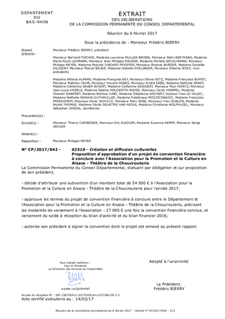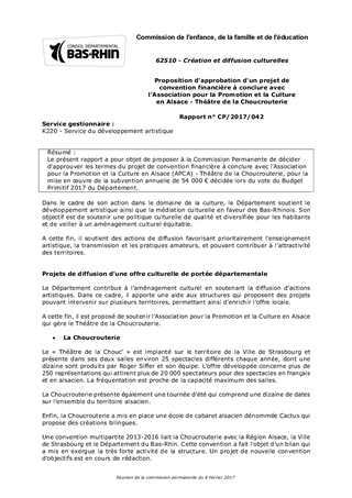 Le présent rapport a pour objet de proposer à la Commission Permanente de décider d'approuver les termes du projet de convention financière à conclure avec l'Association pour la Promotion et la Culture en Alsace (APCA) - Théâtre de la Choucrouterie, pour la mise en œuvre de la subvention annuelle de 54 000 € décidée lors du vote du Budget Primitif 2017 du Département.