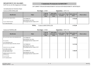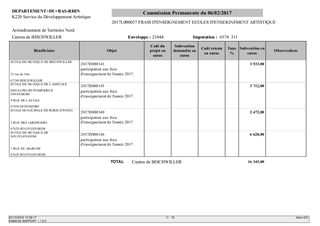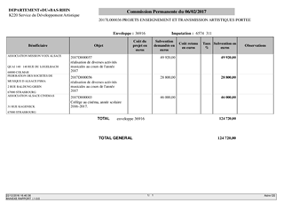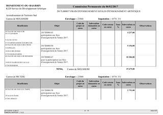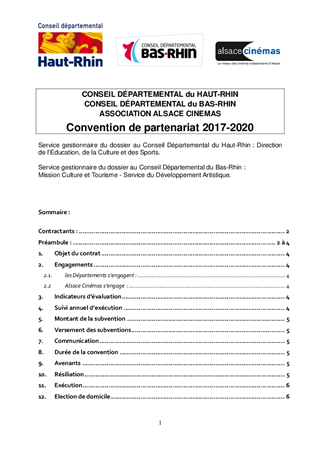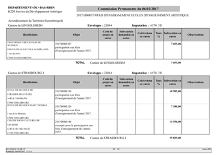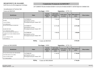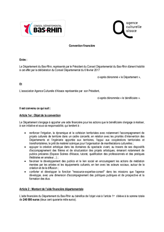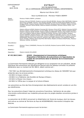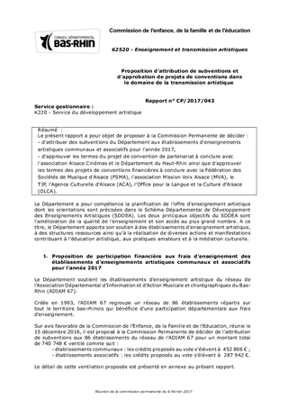 Le présent rapport a pour objet de proposer à la Commission Permanente de décider : - d'attribuer des subventions du Département aux établissements d'enseignements artistiques communaux et associatifs pour l'année 2017, - d’approuver les termes du projet de convention de partenariat à conclure avec l'association Alsace Cinémas et le Département du Haut-Rhin ainsi que d'approuver les termes des projets de conventions financières à conclure avec la Fédération des Sociétés de Musique d'Alsace (FSMA), l'association Mission Voix Alsace (MVA), le TJP, l'Agence Culturelle d'Alsace (ACA), l’Office pour la Langue et la Culture d’Alsace (OLCA).