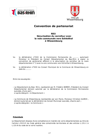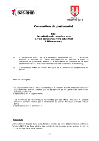 RD 3 - Sécurisation du carrefour de la RD 3 avec la voie communale vers Schleithal à Wissembourg Proposition de convention de partenariat public-public