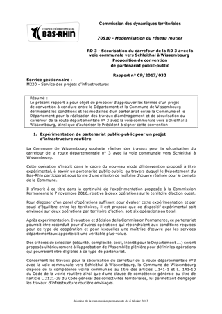 Le présent rapport a pour objet de proposer d'approuver les termes d'un projet de convention à conclure entre le Département et la Commune de Wissembourg définissant les conditions et les modalités d'un partenariat entre la Commune et le Département pour la réalisation des travaux d'aménagement et de sécurisation du carrefour de la route départementale n° 3 avec la voie communale vers Schleithal à Wissembourg, ainsi que d'autoriser le Président à signer cette convention