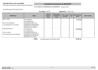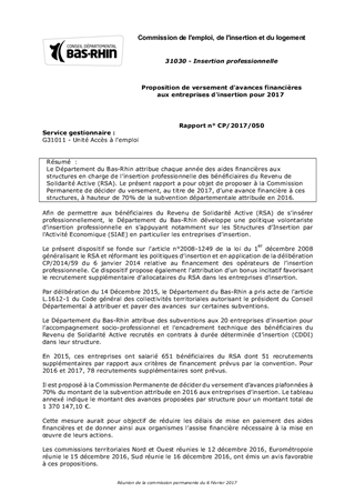 Le Département du Bas-Rhin attribue chaque année des aides financières aux structures en charge de l’insertion professionnelle des bénéficiaires du Revenu de Solidarité Active (RSA). Le présent rapport a pour objet de proposer à la Commission Permanente de décider du versement, au titre de 2017, d’une avance financière à ces structures, à hauteur de 70% de la subvention départementale attribuée en 2016.