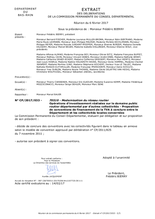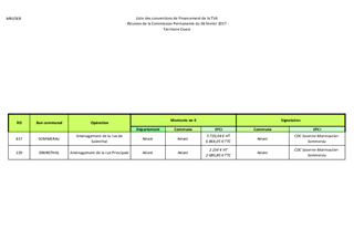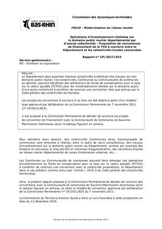 Le Département peut autoriser d’autres collectivités à effectuer des travaux sur son domaine public routier. Ces collectivités, Communes ou Communautés de communes en général, peuvent bénéficier des attributions du fonds de compensation pour la taxe sur la valeur ajoutée (FCTVA) pour les investissements réalisés sur le domaine public d’une autre collectivité à condition de conclure une convention telle que prévue par le Code général des collectivités territoriales. Les projets de conventions à conclure à ce titre ont été établis à partir d’un modèle-type approuvé par délibération de la Commission Permanente du 7 novembre 2011 (n° CP/2011/825). Il est proposé à la Commission Permanente de décider de conclure les projets de convention de financement avec la Communauté de Communes de Saverne-Marmoutier-Sommerau selon le tableau figurant en annexe.