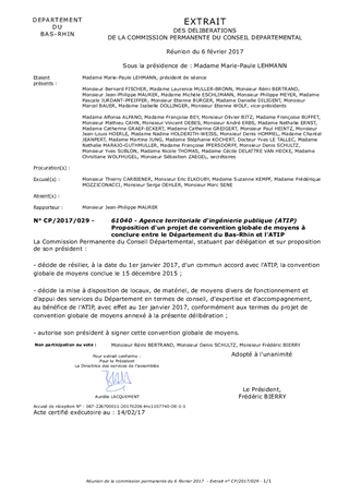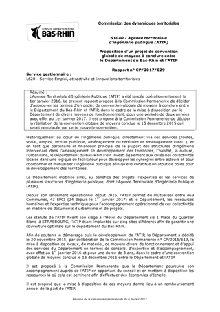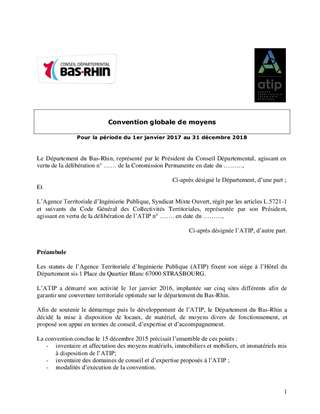 L’Agence Territoriale d’Ingénierie Publique (ATIP) a été lancée opérationnellement le 1er janvier 2016. Le présent rapport propose à la Commission Permanente de décider d’approuver les termes d’un projet de convention globale de moyens à conclure entre le Département du Bas-Rhin et l’ATIP, dans le cadre de la mise à disposition par le Département de divers moyens de fonctionnement, pour une période de deux années avec effet au 1er janvier 2017. Il est proposé à la Commission Permanente de décider la résiliation de la convention globale de moyens conclue le 15 décembre 2015 qui serait remplacée par cette nouvelle convention.