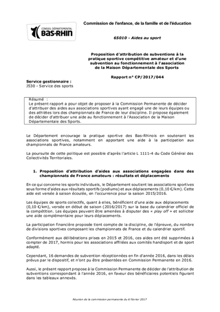 Le présent rapport a pour objet de proposer à la Commission Permanente de décider d'attribuer des aides aux associations sportives ayant engagé une de leurs équipes ou des athlètes lors des championnats de France de leur discipline. Il propose également de décider d'attribuer une aide au fonctionnement à l'Association de la Maison Départementale des Sports.