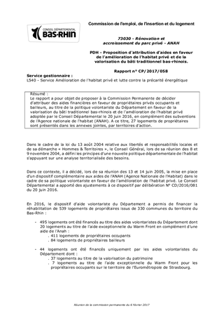 Le rapport a pour objet de proposer à la Commission Permanente de décider d'attribuer des aides financières en faveur de propriétaires privés occupants et bailleurs, au titre de la politique volontariste du Département en faveur de la valorisation du bâti traditionnel bas-rhinois et de l'amélioration de l'habitat privé adoptée par le Conseil Départemental le 20 juin 2016, en complément des subventions de l'Agence nationale de l'habitat (ANAH). A ce titre, 27 logements de propriétaires sont présentés dans les annexes jointes, par territoires d'action.