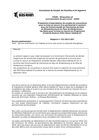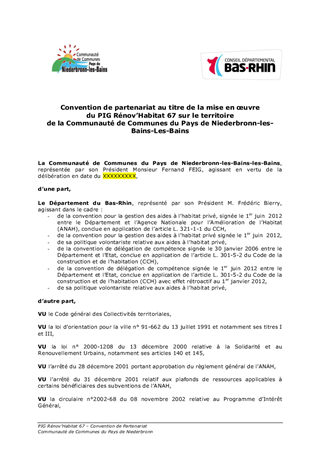 Le présent rapport a pour objet de proposer à la Commission Permanente de décider d'approuver les termes des projets de convention de partenariat à conclure pour la mise en oeuvre du Programme d'Intérêt Général (PIG) Rénov'Habitat 67 sur le territoire des Communauté de Communes du Pays de Wissembourg et du Pays de Niederbronn-les-Bains. Ces propositions de conventions à conclure font suite à la décision de renouvellement des PIG Rénov'Habitat 67 priselors de la réunion du Conseil Départemental du 14 décembre 2015.