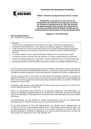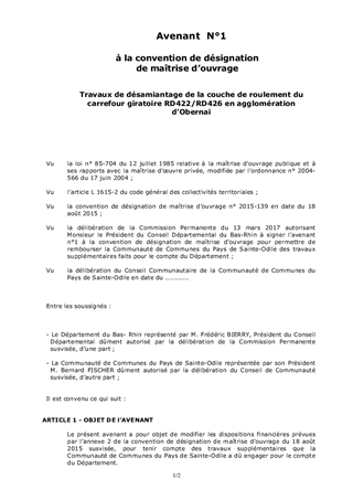 La convention de désignation de maîtrise d’ouvrage n°2015/139, adoptée par la Commission Permanente le 11 mai 2015 sur la base du rapport n° CP/2015/114, visait à confier à la Communauté des Communes du Pays de Sainte-Odile les travaux de désamiantage de la couche de roulement du carrefour giratoire RD422/RD426 à Obernai. Le présent rapport a pour objet de proposer d'approuver les termes d'un projet d'avenant à cette convention afin de prendre en compte l’augmentation du coût des travaux de désamiantage de la chaussée, travaux préfinancés par la Communauté des Communes du Pays de Sainte-Odile et qui sont à porter à la charge du Département.