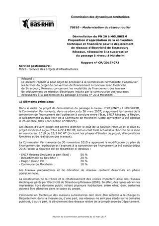 Le présent rapport a pour objet de proposer à la Commission Permanente d'approuver les termes du projet de convention de financement à conclure avec Electricité de Strasbourg Réseaux concernant les modalités de financement des travaux de déplacement de réseaux électriques induits par la construction des ouvrages nécessaires à la suppression du passage à niveau n° 20 à Molsheim