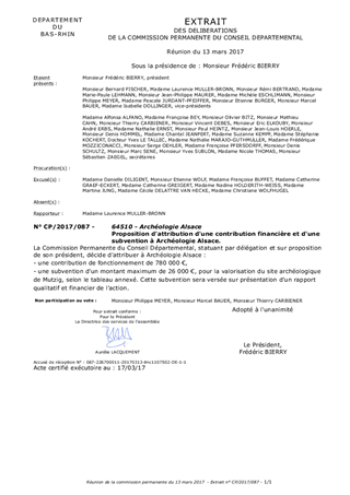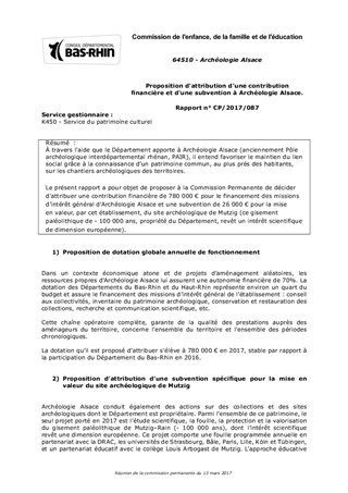 À travers l’aide que le Département apporte à Archéologie Alsace (anciennement Pôle archéologique interdépartemental rhénan, PAIR), il entend favoriser le maintien du lien social grâce à la connaissance d’un patrimoine commun, au plus près des habitants, sur les chantiers archéologiques des territoires. Le présent rapport a pour objet de proposer à la Commission Permanente de décider d'attribuer une contribution financière de 780 000 € pour le financement des missions d’intérêt général d'Archéologie Alsace et une subvention de 26 000 € pour la mise en valeur, par cet établissement, du site archéologique de Mutzig (ce gisement paléolithique de - 100 000 ans, propriété du Département, revêt un intérêt scientifique de dimension européenne).