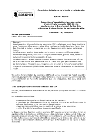 Proposition d'approbation d'une convention d'objectifs pluriannuelle 2017-2019 à conclure entre le Département du Bas-Rhin et le centre d'interprétation du patrimoine La Villa.
