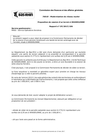 Le présent rapport a pour objet de proposer à la Commission Permanente de décider de la cession d'une parcelle constituant une bande de terrain aménagé avec de l'enrobé, située à WASSELONNE.