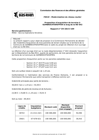 Le présent rapport a pour objet de proposer à la Commission Permanente de décider des modalités d'acquisition de trois parcelles de terrain situées sur le territoire de la Commune de GUMBRECHTSHOFFEN dans le cadre du projet de réfection d'un ouvrage d'art sur la RD 642.