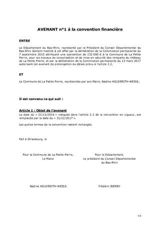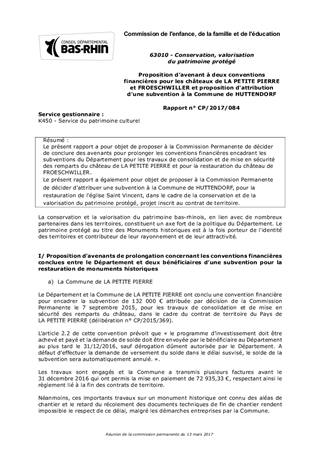 Le présent rapport a pour objet de proposer à la Commission Permanente de décider de conclure des avenants pour prolonger les conventions financières encadrant les subventions du Département pour les travaux de consolidation et de mise en sécurité des remparts du château de LA PETITE PIERRE et pour la restauration du château de FROESCHWILLER. Le présent rapport a également pour objet de proposer à la Commission Permanente de décider d'attribuer une subvention à la Commune de HUTTENDORF, pour la restauration de l'église Saint Vincent, dans le cadre de la conservation et de la valorisation du patrimoine protégé, projet inscrit au contrat de territoire.