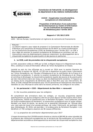 Le présent rapport a pour objet de proposer à la Commission Permanente de décider d'attribuer une subvention de fonctionnement de 50 000 € au Centre d’Information sur les Institutions Européennes (CIIE) de Strasbourg pour l’année 2017. Le CIIE a pour objet de valoriser la vocation européenne de Strasbourg et contribue, par ses interventions dans les établissements scolaires notamment, au développement de la citoyenneté européenne du grand public et des jeunes en particulier.