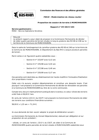 Le présent rapport a pour objet de proposer à la Commission Permanente de décider de céder quatre parcelles de terrain situées le long du giratoire des RD 80 et 248 sur le territoire de la Commune de MUNCHHAUSEN.