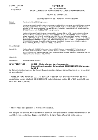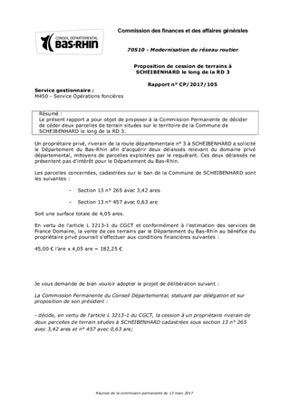 Le présent rapport a pour objet de proposer à la Commission Permanente de décider de céder deux parcelles de terrain situées sur le territoire de la Commune de SCHEIBENHARD le long de la RD 3.