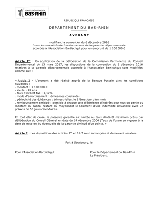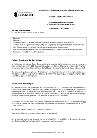 Résumé : Le présent rapport a pour objet de proposer à la Commission Permanente : - d’accorder une garantie d’emprunt pour un prêt souscrit par la Maison de retraite du Sacré Cœur pour l’extension du bâtiment Notre Dame à Dauendorf, - de maintenir la garantie pour un prêt souscrit par l’association Bartischgut pour sa Maison de retraite située à Strasbourg.