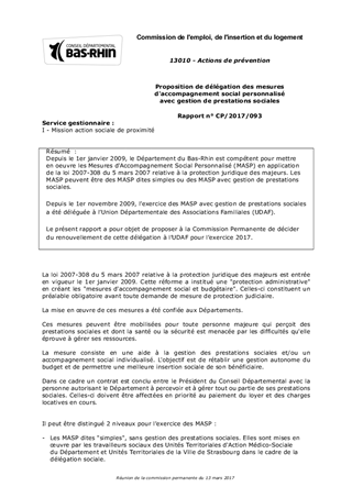 Depuis le 1er janvier 2009, le Département du Bas-Rhin est compétent pour mettre en oeuvre les Mesures d'Accompagnement Social Personnalisé (MASP) en application de la loi 2007-308 du 5 mars 2007 relative à la protection juridique des majeurs. Les MASP peuvent être des MASP dites simples ou des MASP avec gestion de prestations sociales. Depuis le 1er novembre 2009, l’exercice des MASP avec gestion de prestations sociales a été déléguée à l’Union Départementale des Associations Familiales (UDAF). Le présent rapport a pour objet de proposer à la Commission Permanente de décider du renouvellement de cette délégation à l’UDAF pour l’exercice 2017.
