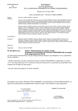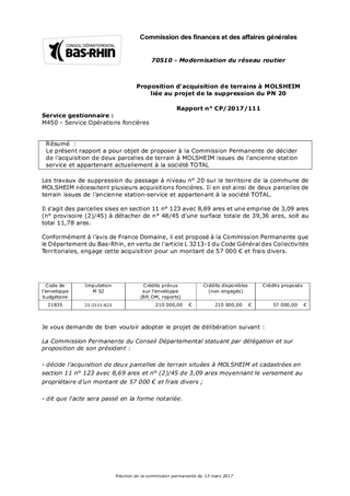 Le présent rapport a pour objet de proposer à la Commission Permanente de décider de l'acquisition de deux parcelles de terrain à MOLSHEIM issues de l'ancienne station service et appartenant actuellement à la société TOTAL