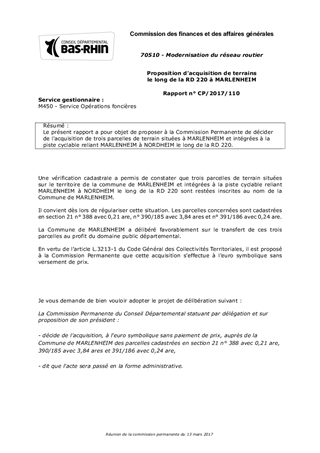 Le présent rapport a pour objet de proposer à la Commission Permanente de décider de l'acquisition de trois parcelles de terrain situées à MARLENHEIM et intégrées à la piste cyclable reliant MARLENHEIM à NORDHEIM le long de la RD 220.