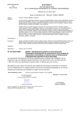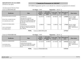 Le présent rapport a pour objet de proposer à la Commission Permanente de décider d'attribuer des subventions, inscrites dans les contrats de territoire, aux Communes de ESCHAU, HERRLISHEIM, KURTZENHOUSE, NIEDERHAUSBERGEN, OBERROEDERN, ROPPENHEIM, TRIEMBACH, STRUTH, STRASBOURG et à la Communauté de Communes de BISCHWILLER ET ENVIRONS. Ce rapport a également pour objet de proposer à la Commission Permanente de décider d'approuver deux projets de conventions financières. Ces subventions concernent la construction, la transformation et la mise aux normes d’équipements sportifs et socio-éducatifs.