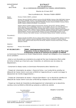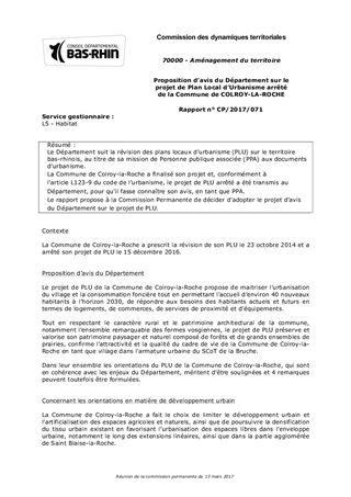 Le Département suit la révision des plans locaux d’urbanisme (PLU) sur le territoire bas-rhinois, au titre de sa mission de Personne publique associée (PPA) aux documents d’urbanisme. La Commune de Colroy-la-Roche a finalisé son projet et, conformément à l'article L123-9 du code de l’urbanisme, le projet de PLU arrêté a été transmis au Département, pour qu’il fasse connaître son avis, en tant que PPA. Le rapport propose à la Commission Permanente de décider d’adopter le projet d’avis du Département sur le projet de PLU.