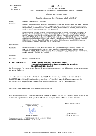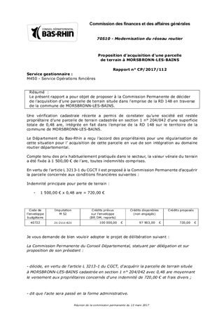 Le présent rapport a pour objet de proposer à la Commission Permanente de décider de l'acquisition d'une parcelle de terrain située dans l'emprise de la RD 148 en traverse de la commune de MORSBRONN-LES-BAINS.