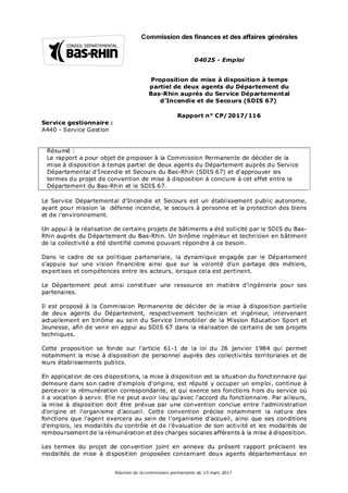Le rapport a pour objet de proposer à la Commission Permanente de décider de la mise à disposition à temps partiel de deux agents du Département auprès du Service Départemental d’Incendie et Secours du Bas-Rhin (SDIS 67) et d'approuver les termes du projet de convention de mise à disposition à conclure à cet effet entre le Département du Bas-Rhin et le SDIS 67.