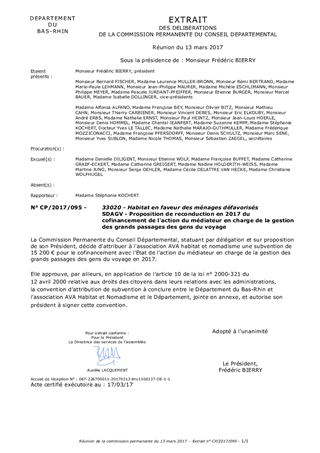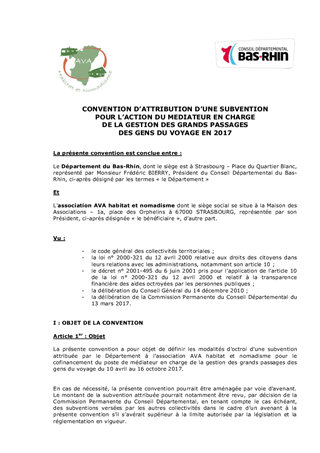 Il est proposé à la Commission Permanente de décider de reconduire le financement en partenariat avec l’Etat, coresponsable du schéma départemental d’accueil des gens du voyage avec le Département, de la mission du médiateur en charge de gérer les passages des grands groupes de voyageurs. Cette intervention est menée depuis 2010 avec succès. Il est proposé à la Commission Permanente de décider de confier cette mission à l'association AVA Habitat et Nomadisme pour une durée de 6 mois du 10 avril 2017 au 16 octobre 2017.