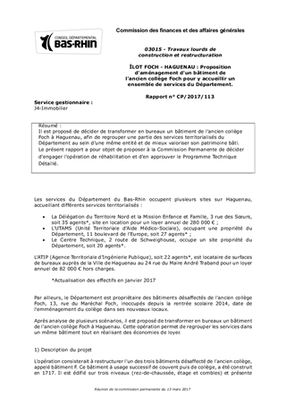 Il est proposé de décider de transformer en bureaux un bâtiment de l’ancien collège Foch à Haguenau, afin de regrouper une partie des services territorialisés du Département au sein d’une même entité et de mieux valoriser son patrimoine bâti. Le présent rapport a pour objet de proposer à la Commission Permanente de décider d'engager l'opération de réhabilitation et d’en approuver le Programme Technique Détaillé.