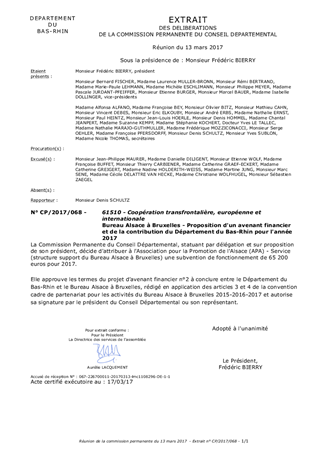 Bureau Alsace à Bruxelles - Proposition d'un avenant financier et de la contribution du Département du Bas-Rhin pour l'année 2017