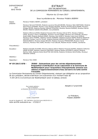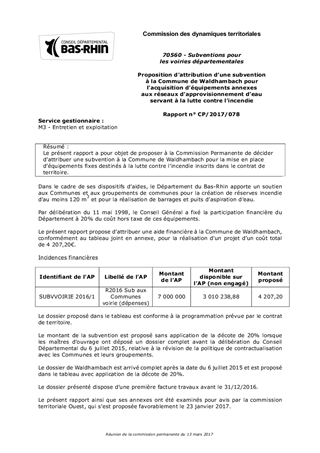 Le présent rapport a pour objet de proposer à la Commission Permanente de décider d’attribuer une subvention à la Commune de Waldhambach pour la mise en place d’équipements fixes destinés à la lutte contre l’incendie inscrits dans le contrat de territoire.