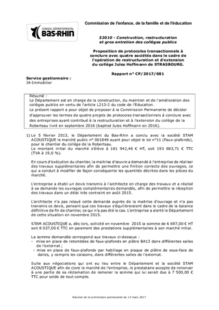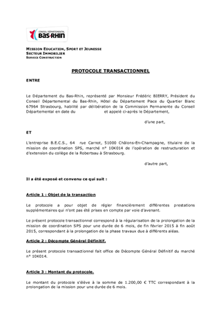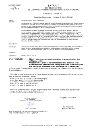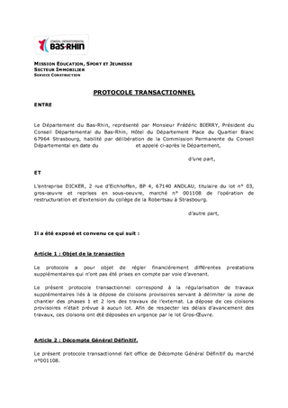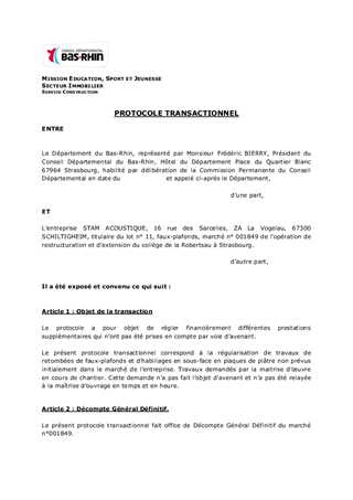 Le Département est en charge de la construction, du maintien et de l'amélioration des collèges publics en vertu de l'article L213-2 du code de l'Education. Le présent rapport a pour objet de proposer à la Commission Permanente de décider d'approuver les termes de quatre projets de protocoles transactionnels à conclure avec des entreprises ayant contribué à la restructuration et à l'extension du collège de la Robertsau livré en septembre 2016 (baptisé Jules Hoffmann en 2016).