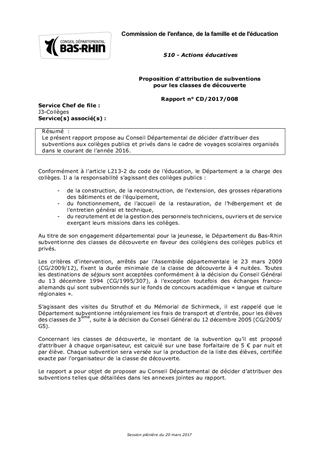 Le présent rapport propose au Conseil Départemental de décider d'attribuer des subventions aux collèges publics et privés dans le cadre de voyages scolaires organisés dans le courant de l'année 2016.