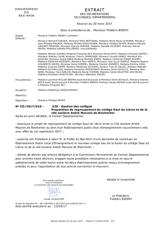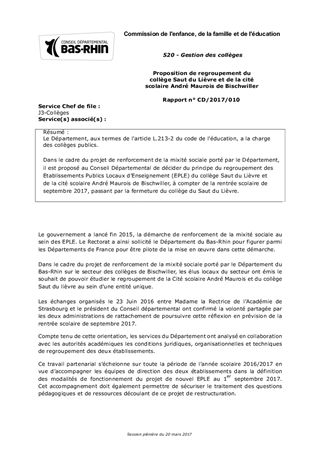 Le Département, aux termes de l’article L.213-2 du code de l’éducation, a la charge des collèges publics. Dans le cadre du projet de renforcement de la mixité sociale porté par le Département, il est proposé au Conseil Départemental de décider du principe du regroupement des Etablissements Publics Locaux d’Enseignement (EPLE) du collège Saut du Lièvre et de la cité scolaire André Maurois de Bischwiller, à compter de la rentrée scolaire de septembre 2017, passant par la fermeture du collège du Saut du Lièvre.
