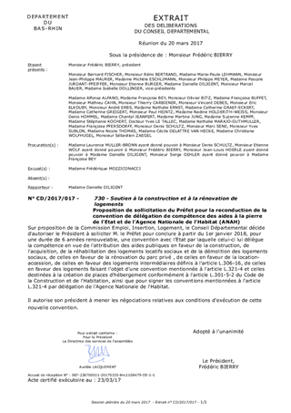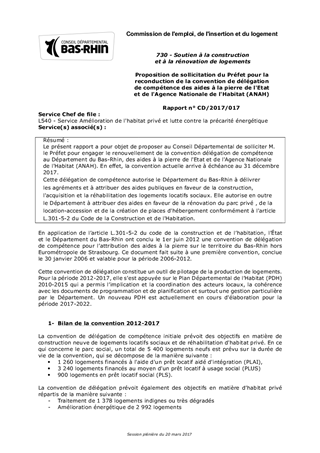 Le présent rapport a pour objet de proposer au Conseil Départemental de solliciter M. le Préfet pour engager le renouvellement de la convention délégation de compétence au Département du Bas-Rhin, des aides à la pierre de l'Etat et de l'Agence Nationale de l'Habitat (ANAH). En effet, la convention actuelle arrive à échéance au 31 décembre 2017. Cette délégation de compétence autorise le Département du Bas-Rhin à délivrer les agréments et à attribuer des aides publiques en faveur de la construction, l'acquisition et la réhabilitation des logements locatifs sociaux. Elle autorise en outre le Département à attribuer des aides en faveur de la rénovation du parc privé , de la location-accession et de la création de places d'hébergement conformément à l'article L.301-5-2 du Code de la Construction et de l'Habitation.