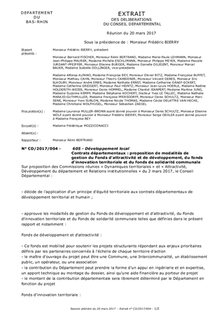 Le Département porte une ambition pour construire des territoires forts et une métropole forte qui favorisent le développement et l’épanouissement des habitants. Dans cette perspective, trois objectifs seraient poursuivis : des territoires connectés, des territoires à énergie positive, des territoires porteurs de leur propre développement. Pour répondre à cette ambition, et parce qu'aucune collectivité ne peut répondre seule à l'ensemble des enjeux de société, l’Assemblée départementale a décidé, par délibération n° CD/2016/158 du 8 décembre 2016 de développer un partenariat renforcé avec les acteurs locaux au travers des contrats départementaux de développement territorial et humain. Dans le prolongement de cette délibération, le présent rapport propose à l'Assemblée départementale de fixer les modalités de gestion du Fonds de développement et d'attractivité, du Fonds de solidarité communale, et du Fonds d'innovation territoriale sur lesquels s'appuient les contrats départementaux. Le Fonds d'urgence a quant à lui été créé par délibération du 20 juin 2016 et doté d'1 million d'euros pour aider les Communes placées en état de catastrophe naturelle à faire face aux travaux de remise en état ou de réparation de leurs biens endommagés non couverts par des assurances ou toute autre forme d'aide financière.