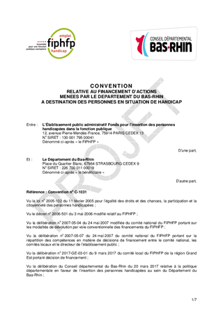 Le Département, premier acteur des solidarités, souhaite conforter sa politique de ressources humaines en matière d’accompagnement et d’insertion des personnes en situation handicap et s’est ainsi engagé dans l’élaboration d’un projet de convention avec le Fonds pour l’Insertion des Personnes Handicapées dans la Fonction Publique. Le présent rapport a pour objet de proposer au Conseil Départemental de décider d'approuver les termes du projet de convention de partenariat pluriannuel 2017 – 2019 à conclure entre le Département du Bas-Rhin et le Fonds pour l’Insertion des Personnes Handicapées dans la Fonction Publique (FIPHFP).