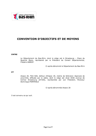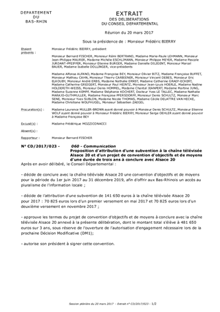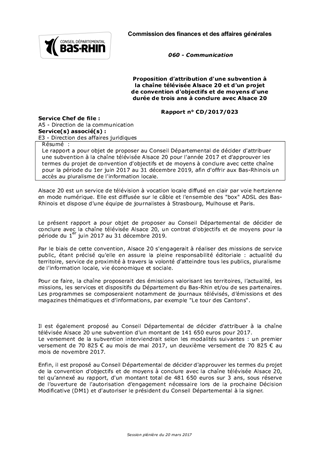 Le rapport a pour objet de proposer au Conseil Départemental de décider d'attribuer une subvention à la chaîne télévisée Alsace 20 pour l'année 2017 et d'approuver les termes du projet de convention d'objectifs et de moyens à conclure avec cette chaîne pour la période du 1er juin 2017 au 31 décembre 2019, afin d'offrir aux Bas-Rhinois un accès au pluralisme de l'information locale.